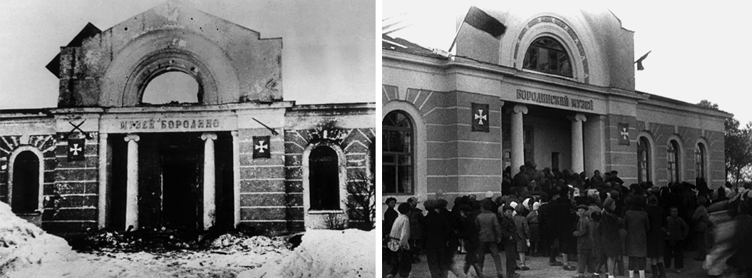 На фото: 1. Разрушеный Музей Бородино. 2. Открытие восстановленного Бородинского музея