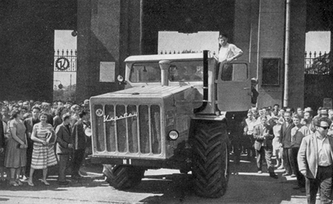 Первый трактор «Кировец» выходит из ворот Кировского завода. 1962 год
