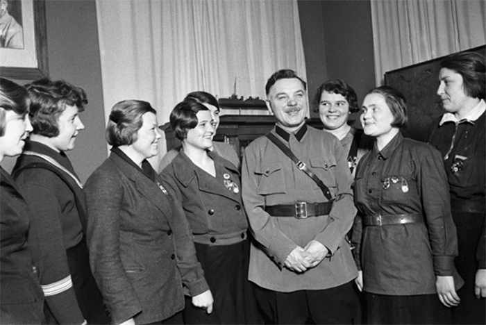 Нарком обороны СССР К. Е. Ворошилов встречается с комсомолками, награждёнными