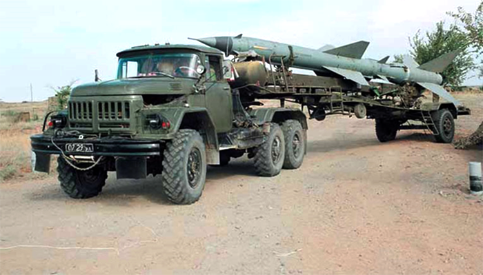 Транспортно-заряжающая машина с полуприцепом и зенитной управляемой ракетой![]()