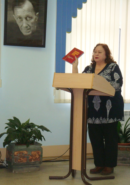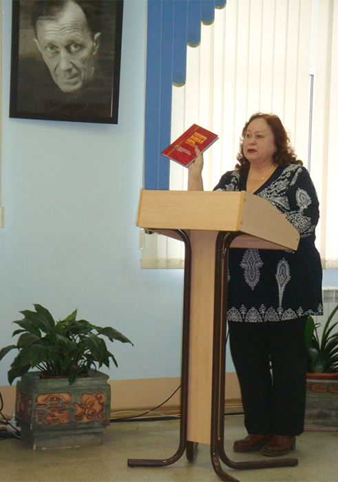 Директор Покровской школы Наталья Александровна Тимофеева на Фуделевских чтениях в Шолоховском Университете с книгой