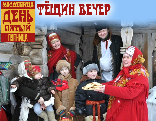 Если в среду зятья гостили у своих тещ, то в пятницу зятья устраивали «тещины вечерки» – приглашали на блины. Являлся и бывший дружка, который играл ту же роль, как и на свадьбе, и получал за свои хлопоты подарок. Званая теща (существовал и такой обычай) обязана была прислать с вечера все необходимое для печения блинов: таган, сковороды, половник, кадушку для опары, а тесть присылал мешок гречневой крупы и коровье масло. Неуважение зятя к этому обычаю считалось бесчестием и обидой, и было поводом к вечной вражде между ним и тещей.