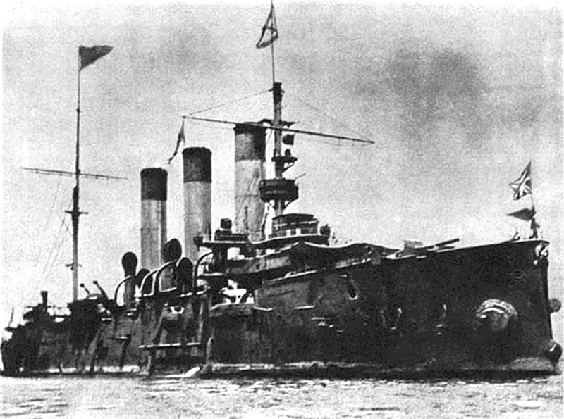 «Аврора» состояла в отряде крейсеров контр-адмирала Энквиста и в ходе Цусимского боя добросовестно выполняла приказ Рожественского – прикрывала транспорты. Задача эта была явно не по плечу четырём русским крейсерам, против которых действовали сначала восемь, а потом шестнадцать японских. От геройской гибели их спасло только то, что к ним случайно подошла колонна русских броненосцев, отогнавших наседавшего неприятеля. «Аврора» получила около десятка попаданий, имела ряд повреждений и серьёзные потери в команде – до ста человек убитыми и ранеными. Погиб и командир. Его фотография экспонируется ныне в музее крейсера в обрамлении пробитого осколком японского снаряда стального листа обшивки и обгорелых досок настила палубы.