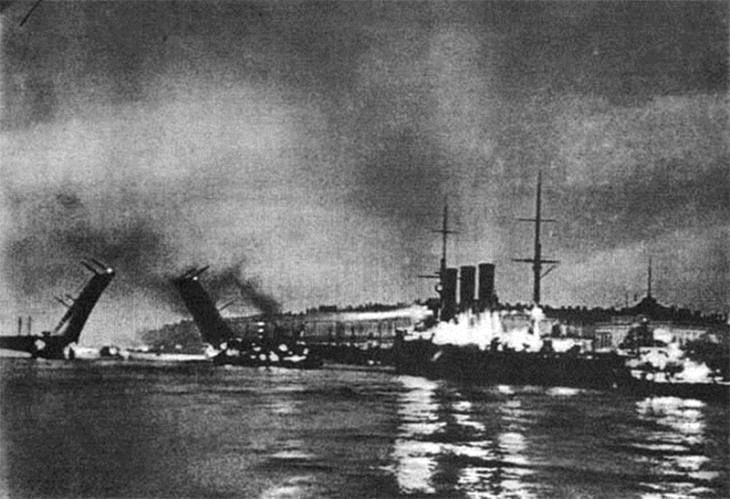 Несколько слов о роли «Авроры» в событиях октября 1917 года в Петрограде. Затея расстрелять Зимний дворец из орудий крейсера была чистой воды блефом. Крейсер стоял в ремонте, и потому весь боезапас с него выгрузили в полном соответствии с действовавшими инструкциями. А штамп «залп «Авроры» неверен, поскольку «залп» – это одновременно произведённые выстрелы из как минимум двух стволов.